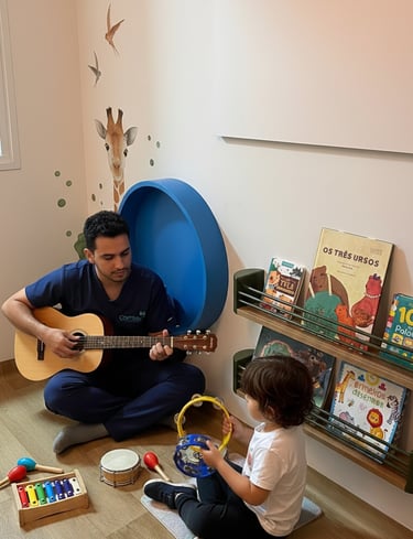 A musicoterapia é uma ciência mediada por arte e ludicidade, e temos orgulho de oferecer esta especialidade às nossas crianças, cujos principais objetivos estão ligados a diminuição do estresse, melhora na expressão de sentimentos e na comunicação, aprimoramento de comportamentos sociais e comunicação (por meio de vocalizações e ampliação do vocabulário), expansão na capacidade de foco e atenção, coordenação, compreensão rítmica e redução de ansiedade. A música estimula o processamento emocional, auditivo e cognitivo, o que a liga a uma elevação na qualidade de vida das crianças que cursam com transtornos do neurodesenvolvimento. Com a musicoterapia, as crianças podem aperfeiçoar sua compreensão e expressão emocional, obter melhora nas funções cognitivas, além de reduzir a hiperatividade. Com esses processos bem estabelecidos, os pequenos têm espaço para um aprendizado significativo, divertido e duradouro.